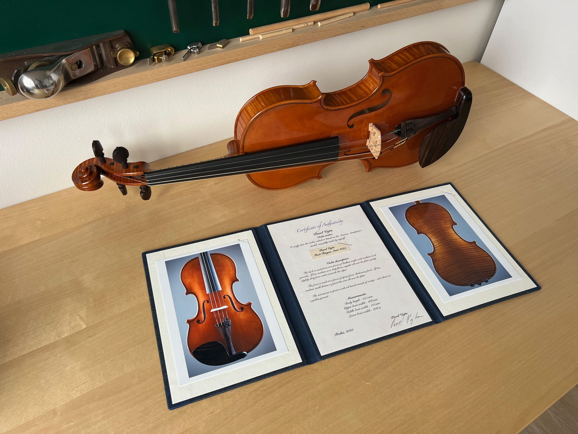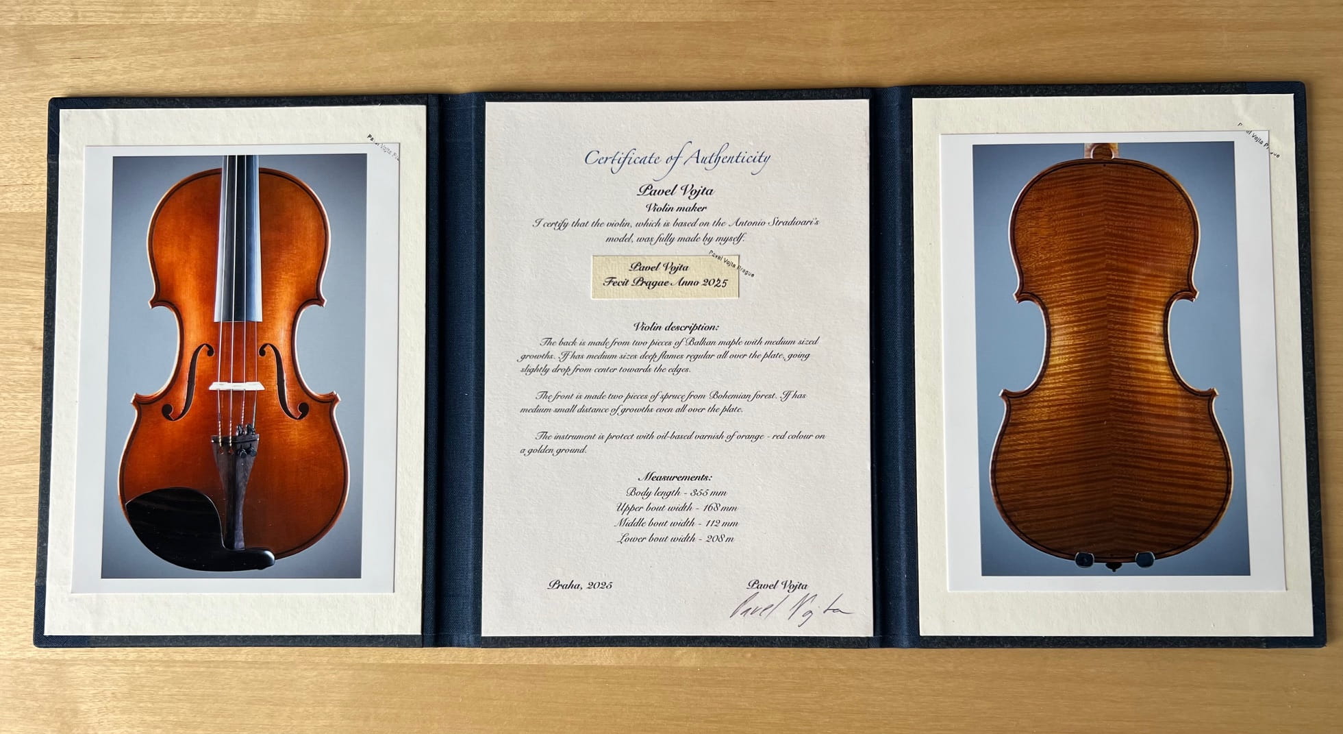 Certifikát pravosti vyrobený na zakázku pro houslaře Pavla Vojtu.