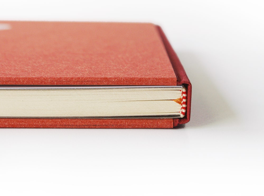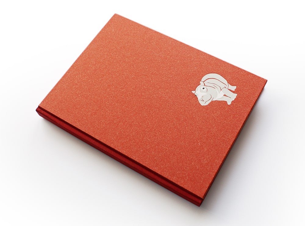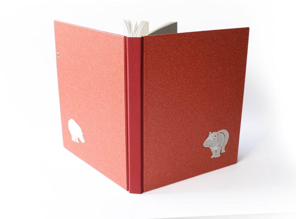 Ručně šitá poloplátěná vazba, šitý kapitálek a záložka. Desky jsou potažené kvalitním potahovým papírem červené barvy a zdobené intarzií hrocha. Hřbet knihy je pro větší odolnost potažen plátnem. Knižní blok je z grafického krémového papíru 120 g/m², má předtištěný titulní list a tiráž. Knihu doplňuje kovový držáček na tužku, přichycený na vnitřní straně desek.