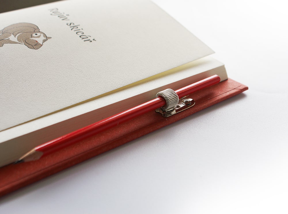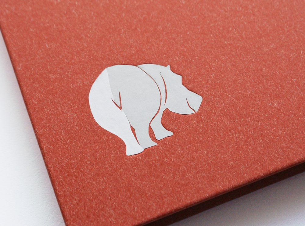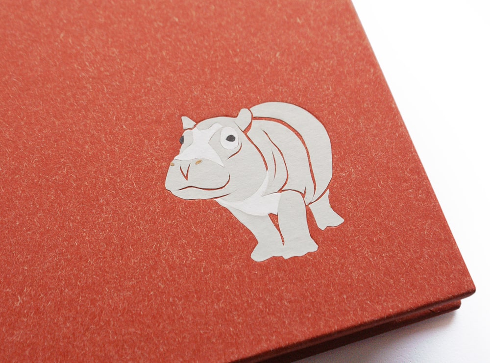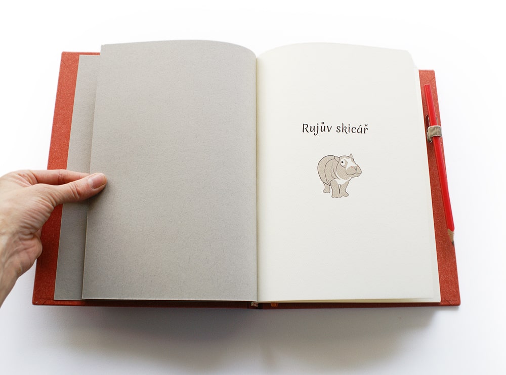 Deník vyrobený na zakázku s motivem hrocha na předních i zadních deskách. Kniha je doplněna držáčkem na tužku.