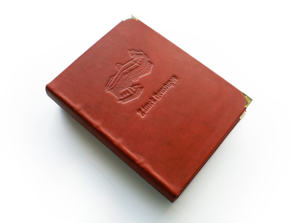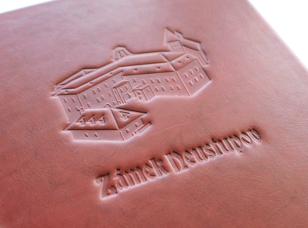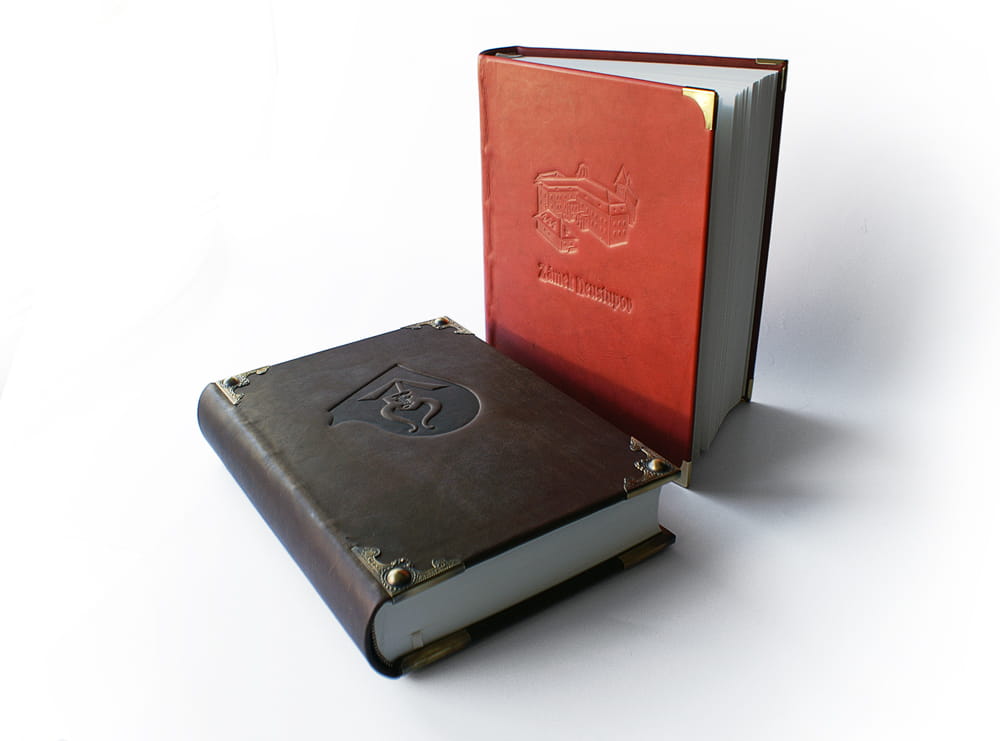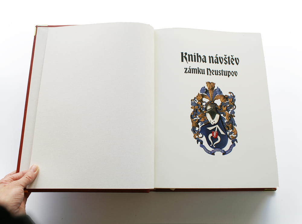 Kožená kniha návštěv zámku Neustupov vyrobená na zakázku jako exkluzivní knižní vazba s kováním. Knižní desky jsou zdobené ražbou siluety zámku a titulu „Zámek Neustupov“, blok má 500 stran s předtištěným úvodem a tiráží.