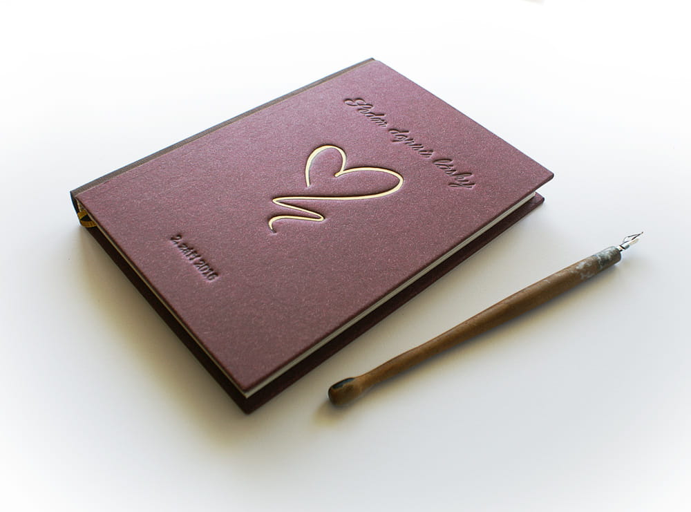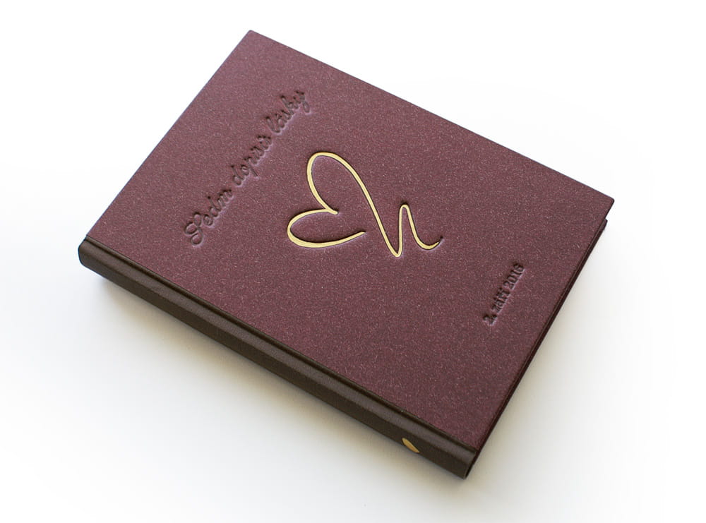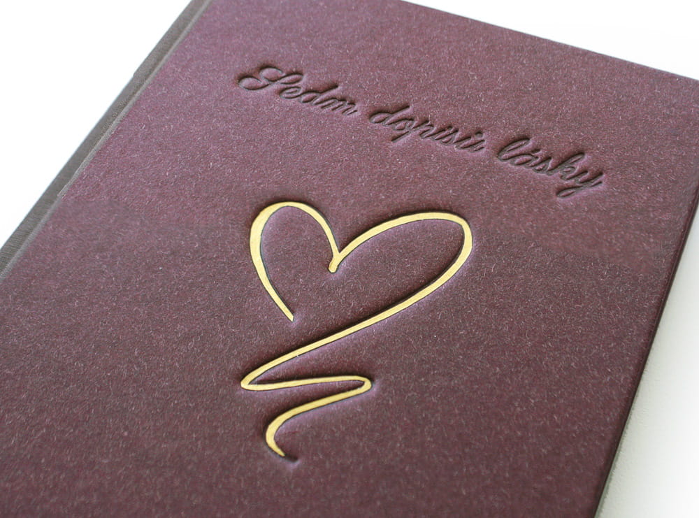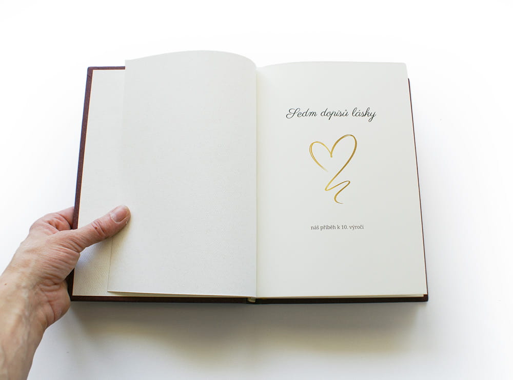 Výroční kniha Sedm dopisů lásky vyrobená na zakázku. Kniha je vázaná do vínového papíru, na hřbetu a přední desce je zdobená aplikací zlatého srdce doplněného ražbou titulu a data. Kniha je kompletně zpracovaná od sazby, předtiskové přípravy až po realizaci.