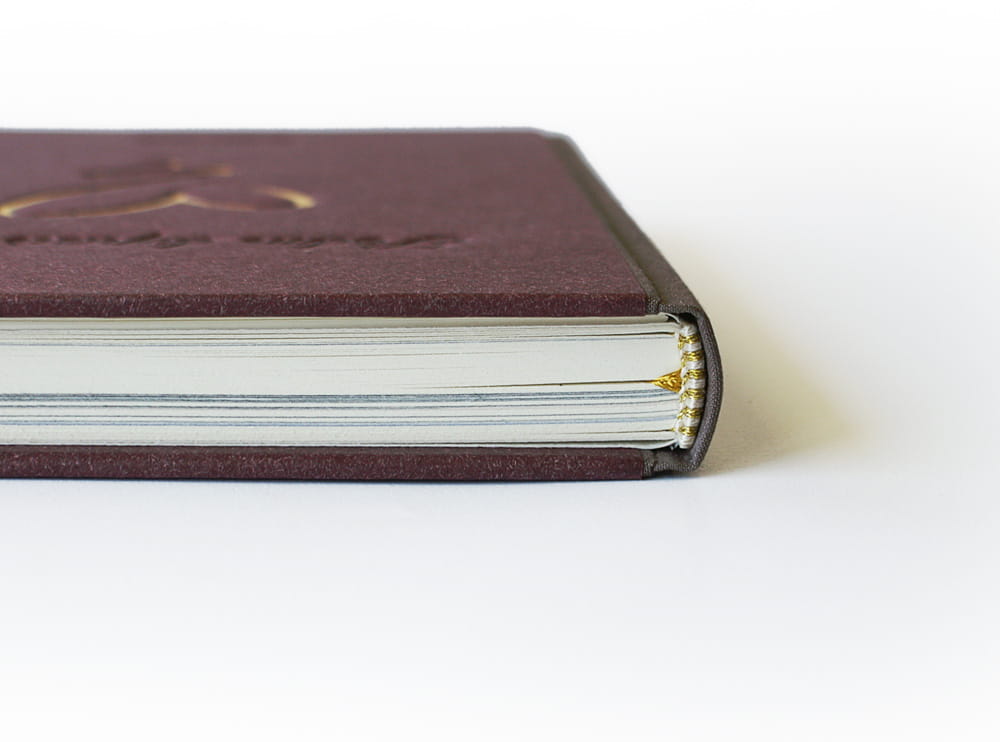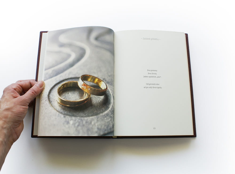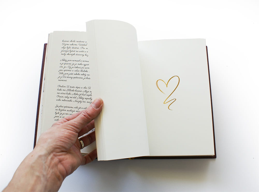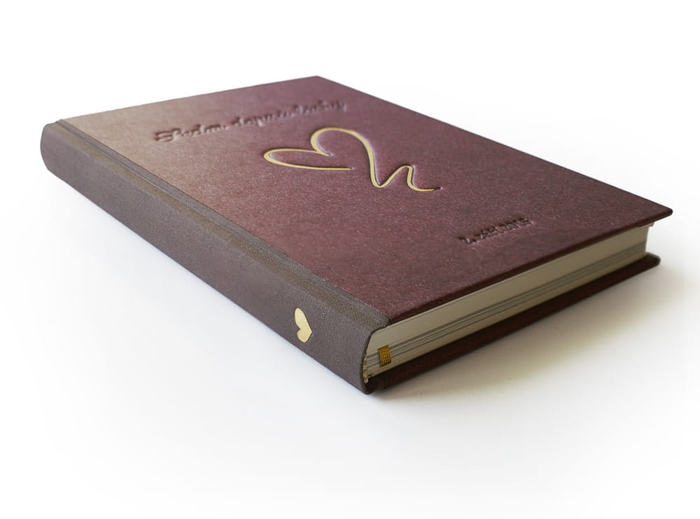 Ručně šitá poloplátěná vazba, šitý kapitálek, záložka. Desky jsou potažené kvalitním potahovým papírem vínové barvy, zdobené ražbou titulu, data a kresbou zlatého srdce. Hřbet knihy je potažený plátnem s aplikovným zlatým srdcem. Knižní blok je celobarevně vytištěný a svázáný z přírodně bílého papíru 150 g/m². Kniha je kompletně zpracovaná od sazby, předtiskové přípravy až po realizaci.